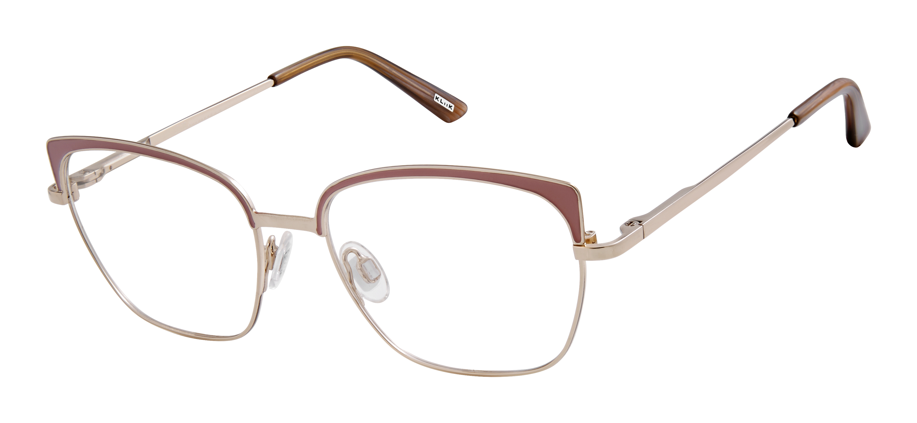 Stainless steel style K-663 is a modified square shape with winged end pieces for a catty look. The hand-painted browline in a matte finish is contrasted with the shiny metallic finish on the top rim and temples. This style is available in teal gun, eggplant rose gold, black and taupe gold.