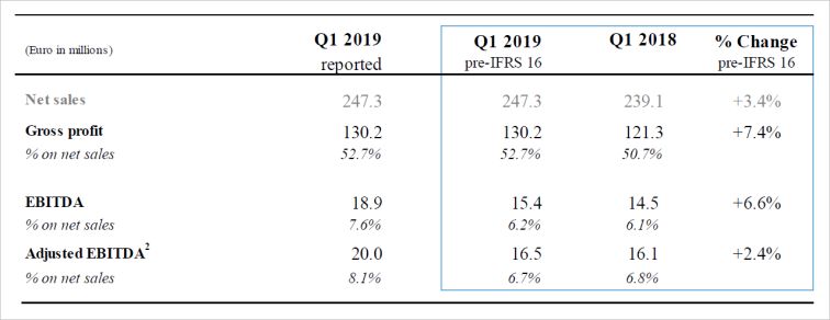 In Q1 2019, reported adjusted(2) EBITDA of the Continuing Operations reached Euro 20.0 million. On a pre-IFRS 16 basis, excluding the positive accounting effect, equal to Euro 3.4 million, of the first application of the new standard to Q1 2019, the Group’s Continuing Operations posted an adjusted(2) EBITDA of Euro 16.5 million, with the margin on sales standing at 6.7%. For Safilo, this result marked a significant operational improvement compared to the adjusted(2) EBITDA of Euro 16.1 million reported in Q1 2018, which included the income of Euro 9.8 million for the early termination of the Gucci license.