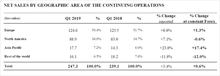 In Q1 2019, the Group’s economic performance grew in fact 200 basis points at the Gross margin level, from 50.7% to 52.7% of net sales mainly thanks to higher plant efficiencies and lower obsolescence costs, and recovered additional 200 basis points at the operating expenses level following the ongoing progress in the overheads saving program.