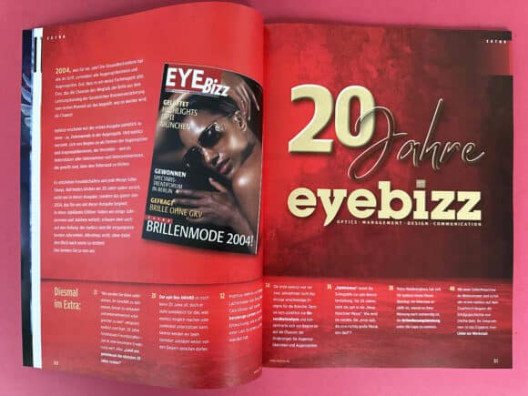Aber eyebizz steht nicht für vage Gedankenspiele, eyebizz wollte von Beginn an Ihr Geschäft optimieren und Sie dabei unterstützen, „besser zu verkaufen und unternehmerisch erfolgreicher zu sein.“ So steht es geschrieben in der allerersten Ausgabe vor zwei Jahrzehnten. Damals hoffte man, dass die Brille ein Mode- und Lifestyle-Produkt sein kann, das unabhängig von Zuschüssen der Krankenkasse nach Lust und Laune gekauft wird. Da kam eyebizz gerade recht!