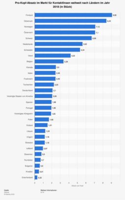 Ganz anders bei Kontaktlinsen, da rangiert Deutschland – beim Pro-Kopf-Absatz – an 14. Stelle bei 29 verglichenen Ländern. Interessant: Finnland steht hier an erster, Griechenland an letzter Stelle.