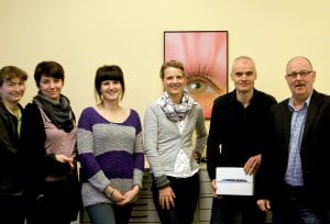 Neben dampfenden Cocktails sorgten auch ein Appenzeller Hackbrettspieler und ein Gewinnspiel für viel Spaß und Unterhaltung am Stand. Der Gewinn, ein iPad Air, ging an Stephan Wunderlich vom Clip Contactlinsenstudio Potsdam. Das gesamte Team freute sich über den Gewinn, den Dieter Mangerich von Bach Optic persönlich überreicht hat. Im Bild vrnl: Dieter Mangerich, Stephan Wunderlich & Team.