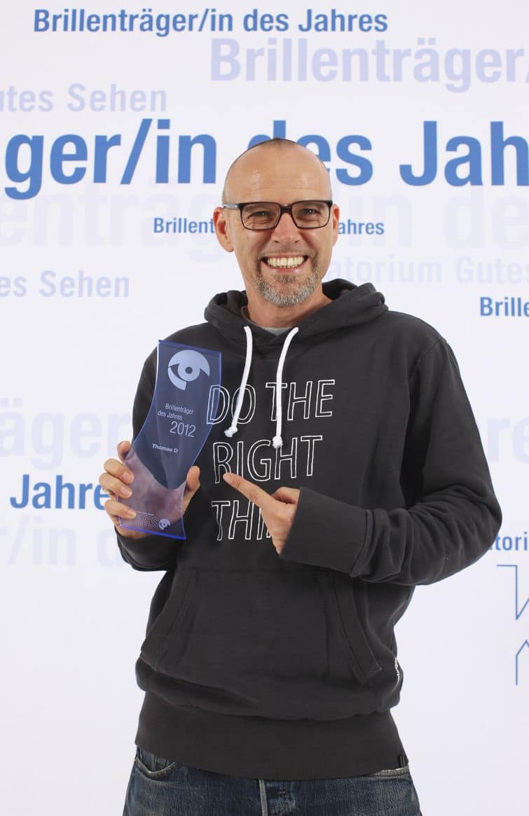 Dass ihn 2012 das Kuratorium für gutes Sehen (KGS) zum Brillenträger des Jahres gekürt hat, habe Thomas D erstaunt, aber auch etwas gefreut: „Immerhin bemerkt die Welt, dass man seine Brille mit Stolz trägt!“