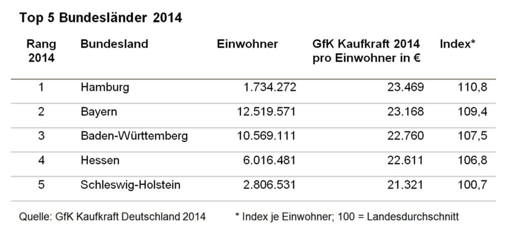 Auf Ebene der Bundesländer erhöht Hamburg den Vorsprung gegenüber Bayern. Auf dem dritten Platz behauptet sich Baden-Württemberg vor Hessen. Sechs der 16 Länder weisen eine überdurchschnittliche Kaufkraft pro Kopf auf. Nordrhein-Westfalen markiert in etwa den Bundesdurchschnitt. Die ostdeutschen Bundesländer liegen noch immer unter dem gesamtdeutschen Pro-Kopf-Durchschnitt. Das Schlusslicht bildet Sachsen-Anhalt.
