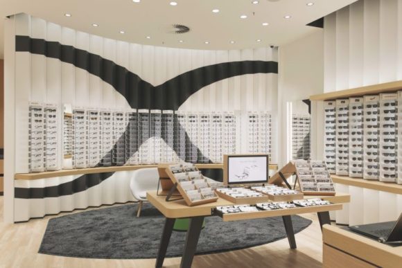Alles strahlt, links die Damen-, rechts die Herrenfassungen. Ob Rechteck, Schmetterling, Rund oder Halbrand: Die Kunden dürfen stöbern. Marken sind die dritte Dimension, aber auch die Breite der Fassungen ist sortiert: unten die Kleinen, oben die Großen. Ausgesuchtes landet direkt auf einem Vierer-Tablett – genau wie bei der Ansichtsbestellung im Online-Shop. Die Kunden sitzen am mittigen Consulting-Desk neben ihrem Berater. Wie neben einem Freund.