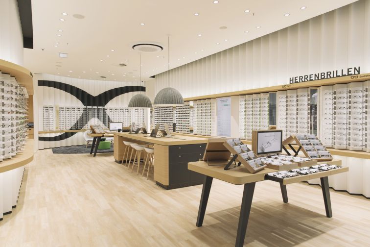 Deutsche sind bekanntlich Reise-Weltmeister. Durch die Mister Spex-Welt reisen sie nach Plan, werden geführt ohne Irrungen und Wirrungen. Klatt spricht von Filtern, die stationär wie online die gleichen sind, um das Einkaufserlebnis so angenehm wie möglich zu machen: „Das ist ein großer Vorteil, dass wir online schon so viele Erfahrungen haben. Alles, was im Netz gut läuft, sollen unsere Kunden auch in unseren Läden erleben.“ Das geht bei der Farbgebung los. Alles hell, helles Holz am Boden, in den Regalen, auch Weiß, die großen filzartigen Lampen dann in hellem Grau. Der Boden besteht allerdings aus strapazierfähigem Vinyl und hat Holzoptik.