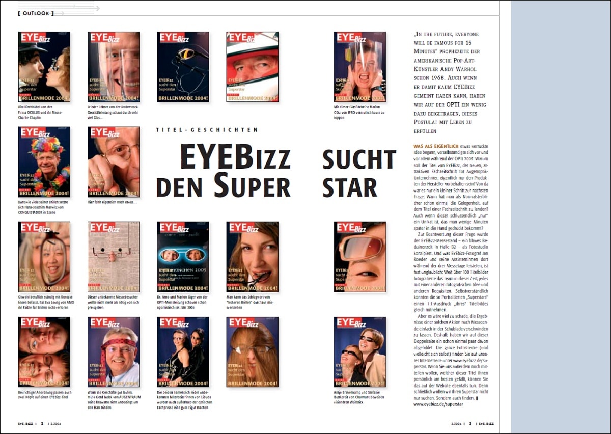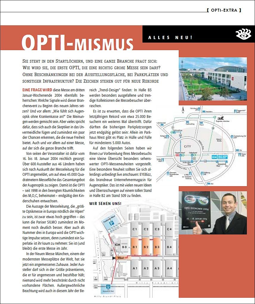 „Optimismus“ lautet die Schlagzeile in der eyebizz-Ausgabe 1 des Jahres 2004 – die Premieren-Ausgabe! Neben dem eigenen Messestand, für den sich die eyebizz etwas besonderes ausgedacht hat, steht vor allem die Frage im Vordergrund der opti-Berichterstattung, wie sie werden wird, die „erste opti, die eine richtig große Messe sein darf“?