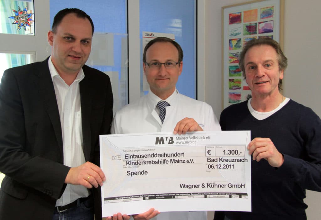 Klaus Kühner, Inhaber von Wagner + Kühner, überreichte gemeinsam mit Regionalvertriebsleiter René Landau offiziell den Scheck an Prof. Dr. med. J. Faber aus dem Vorstand der Kinderkrebshilfe Mainz e.V. Der Spendenbetrag setzte sich zusammen aus den Aktionen „Spende statt Etui“ und „Spende statt Geschenke“ bei dem die Geschäftsführung auf die Weihnachtsgeschenke der Mitarbeiter der Firma Wagner + Kühner verzichtete, und zu guter Letzt rundete das Unternehmen den Betrag auf.