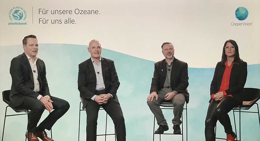 Auf einer Online-Pressekonferenz wurde die Koperation von CooperVision mit Plastic Bank vorgestellt (von links): Johannes Zupfer (Geschäftsführer DACH), Jérôme Kuzio (Head of Marketing DACH bei CooperVision), Peter Nitschke (Plastic Bank) und Carina Freytag-Hafen (Augenoptikermeisterin) (Bild: screenshot)