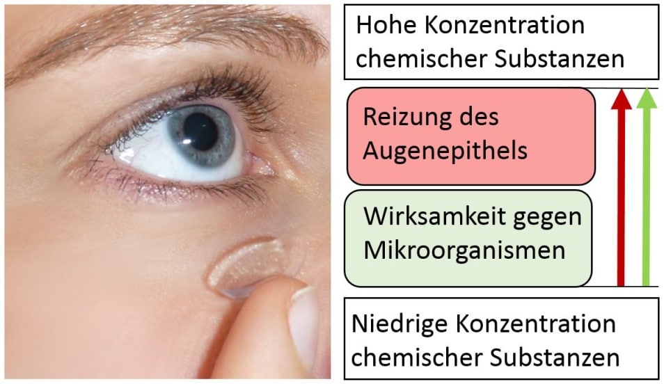 Mikroorganismen, die mit der Linse ins Auge gelangen könnten, müssen während des Desinfektionsprozesses abgetötet werden. Dafür werden heutzutage sogenannte Multifunktionslösungen oder auf Wasserstoffperoxid basierende Desinfektionslösungen genutzt, in denen die Kontaktlinse über Nacht gelagert wird. Diese besitzen Inhaltsstoffe, welche die Zellintegrität zerstören und damit zu einer Keimreduktion beitragen. Ähnliche Mechanismen wirken jedoch auch auf die Zellen der Augenoberfläche, sodass diese durch das Desinfektionsmittel gereizt werden, wenn Rückstände davon mit der Linse ins Auge wieder eingesetzt werden.