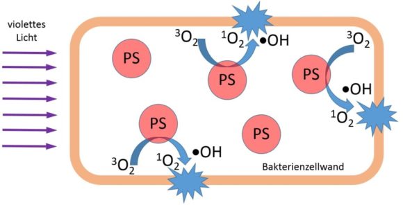 Bakterien enthalten sogenannte Photosensitizer wie Porphyrine, die violettes Licht absorbieren und dabei aus Sauerstoff Radikale erzeugen können, sogenannte reaktive Sauerstoffspezies (ROS), die dann bakterielle Strukturen von innen heraus angreifen und somit zum Zelltod führen.