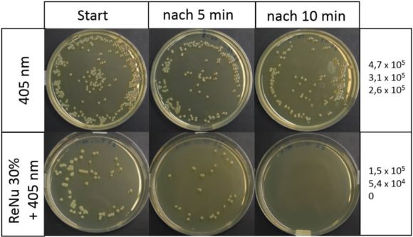 Abbildung 3: Vergleich von reiner Bestrahlungsdesinfektion (405 nm) und kombinierter Desinfektion mit dem Multifunktionsmittel ReNu an Pseudomonas fluorescens (Bilder von B. Kluger)