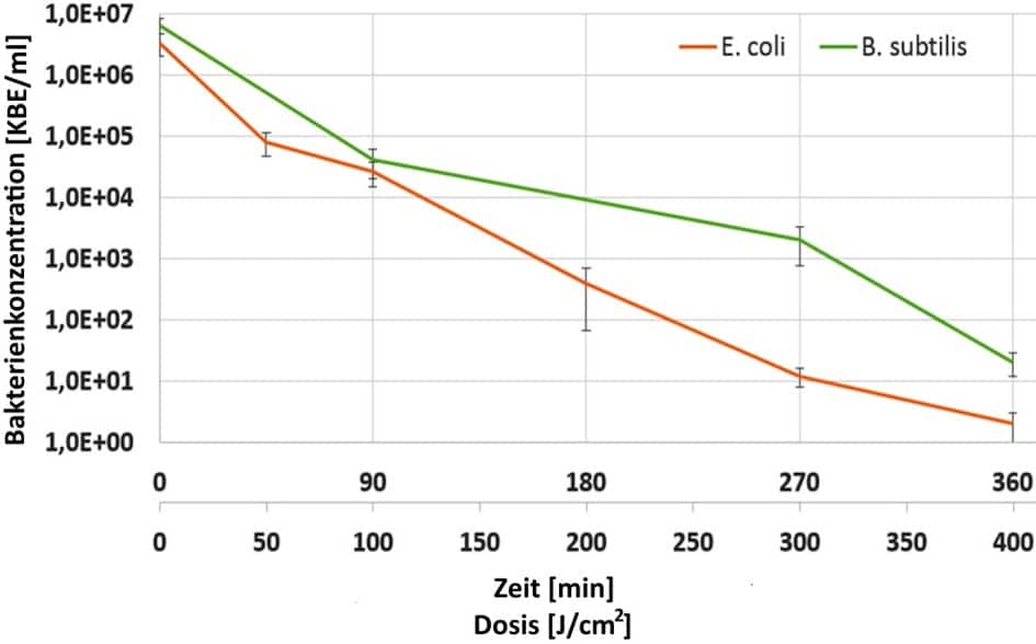 Abbildung 4: Desinfizierende Wirkung von 405-nm-Strahlung auf Escherichia coli (Testorganismus aus DIN EN ISO 14730 für Kontaktlinsenpflegemittel) und Bacillus subtilis (besonders strahlungsresistentes Bakterium)