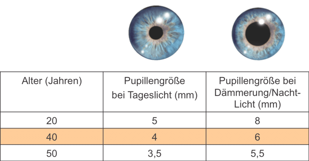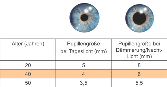 Doch diese Zurückhaltung muss nicht mehr sein! Es gibt einige neue Kontaktlinsen auf dem Markt, die sehr viel mehr Zuverlässigkeit und gute Abbildungsqualität in allen Entfernungen erreichen. Eine ganz entscheidende Neuerung in den Systemen ist die Berücksichtigung der altersbedingt kleineren Pupillengröße der Zielgruppe 40+. Die Abbildung 1 zeigt die Veränderung der Pupillengröße in Abhängigkeit des Alters. Ab dem 40. Lebensjahr erreicht die Pupille bei Tageslicht eine Größe von 4mm; am Abend bei Dämmerungslicht wird die Pupillenöffnung nicht größer als 6mm. Einige multifokale Kontaktlinsen verteilen die Stärken der Ferne, des Zwischenbereichs und der Nähe jedoch auf eine bei Einstärken-Kontaktlinsen übliche 7,5-8,5mm große optische Zone der Linse. So kann die Ferne (bzw. Nähe je nach System), wie in Abbildung 2a dargestellt, aber nicht genutzt werden.