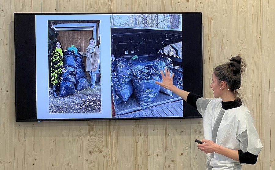 Velia Dietz auf dem Sustainability Hub: Festgehalten in der Präsentation ist der Moment, als Carina Freytag-Hafen knapp einhundert Kilogramm Blister vorbei bringt