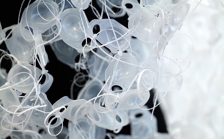Dinge, die im Alltag keine Beachtung finden. Flaschenringe, Luftpolster-Material oder Plastikfolien. Ich habe auch schon mit Brillen- und Lupengläsern gearbeitet, die ich von Fielmann bekommen habe. Es soll dann als Kunstobjekt immer nach Textil aussehen, und die verwendeten Materialien dürfen dabei auch erst beim zweiten oder dritten Hinschauen richtig erkannt werden.
