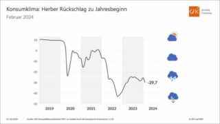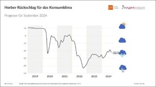 28. August 2024 – Nach der deutlichen Erholung im Vormonat erleidet das Konsumklima in Deutschland im August einen herben Rückschlag. Da zudem die Sparneigung in diesem Monat anstieg, trübt sich das Konsumklima ein: Es sinkt in der Prognose für September im Vergleich zum Vormonat um 3,4 Zähler auf –22,0 Punkte.