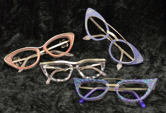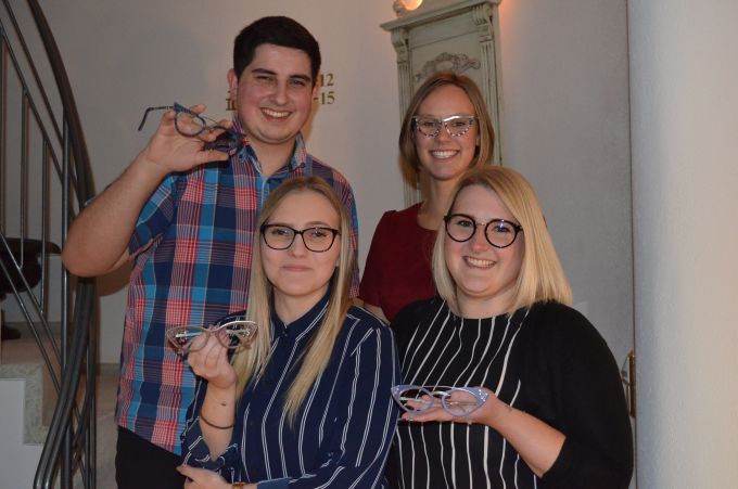 Die vier Siegerbrillen beim Praktischen Leistungswettbewerb „Profis leisten was!“ 2018 (von links: Brillen von Bundessiegerin Anita Lotakow, Jana Engelke (Die gute Form im Handwerk), Mitte: Zweite Siegerin Annika Fuder, im Vordergrund: Dritter Sieger Darvin Matura