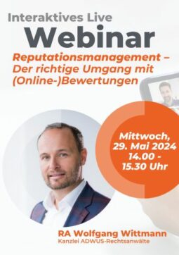 Referent ist Rechtsanwalt Wolfgang Wittmann, der sich mit seiner Kanzlei ADWUS Rechtsanwälte auf Internet-Bewertungen spezialisiert hat und Unternehmen und Berufsverbände in Reputations-Fragen berät.