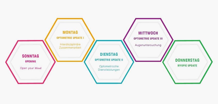 Das umfangreiche Fachprogramm mit 30 Fachexperten wurde abwechslungsreich geplant, z.B. mit interaktiven Aktionen wie Rate- und Gewinnspiel, Interviews mit Studiogästen usw. Dabei werden die Moderatoren Fritz Paßmann, Gero Mayer und Philipp Hessler eine wichtige Rolle einnehmen. Der Blick in die nähere Zukunft der Augenoptik und Optometrie als Highlight des abendlichen Events vorgesehen. Jeder der fünf Online-Abende, die jeweils um 19.30 Uhr starten und bis 21.45 Uhr angedacht sind, steht unter einem anderen Schwerpunktthema.