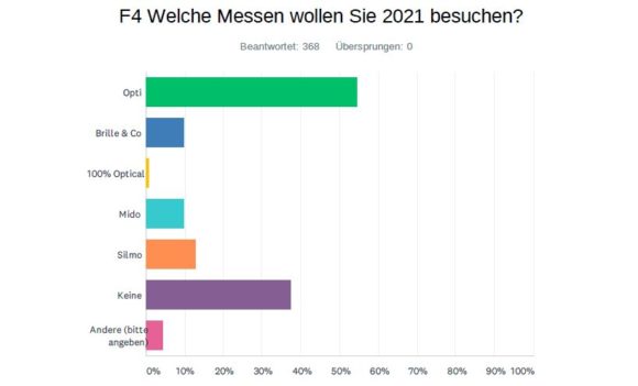 Mehr als die Hälfte der Antwortenden (54 %) wollen im nächsten Jahr die opti besuchen, 13 % die Silmo und zehn Prozent die Mido. Doch 38 % der Befragten wollen 2021 auf jeden Messebesuch zu verzichten.