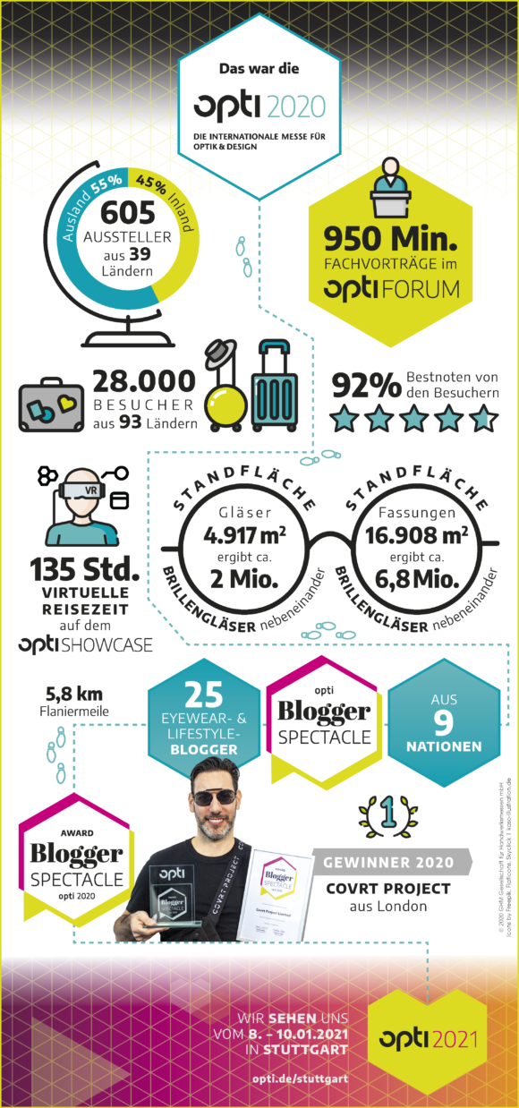 Weiterer Höhepunkt auf dem opti FORUM war die Verleihung des BLOGGER SPECTACLE Award 2020 an den besten Newcomer in den opti BOXEN. Von 25 internationalen Eyewear- und Lifestyle-Bloggern aus elf Ländern wurde die junge Marke Covrt Project Limited aus London des Designers Marcello Martino gekürt. Auch der opti SHOWCASE zum Thema „Unternehmenspositionierung“, das mittels VR-Brille in Kombination mit persönlicher Beratung angeboten wurde, stieß auf reges Interesse.
