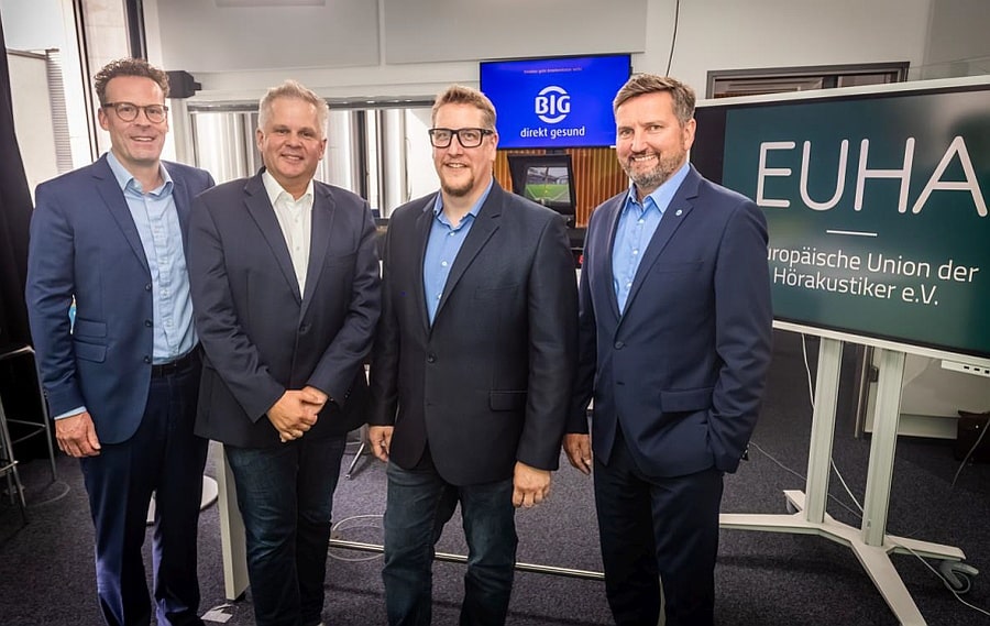 Beim Webinar mit dabei waren (von links): Dirk Köttgen (Geschäftsführer der Köttgen Hörakustik GmbH & Co. KG), EUHA-Geschäftsführer Tobias Bartels, Stefan Ernst (BGM-Teamleiter bei BIG direkt gesund) und Peter Kaetsch (Vorstandsvorsitzender der BIG direkt gesund) (Bild: BIG direkt gesund/Stefan Schütze)