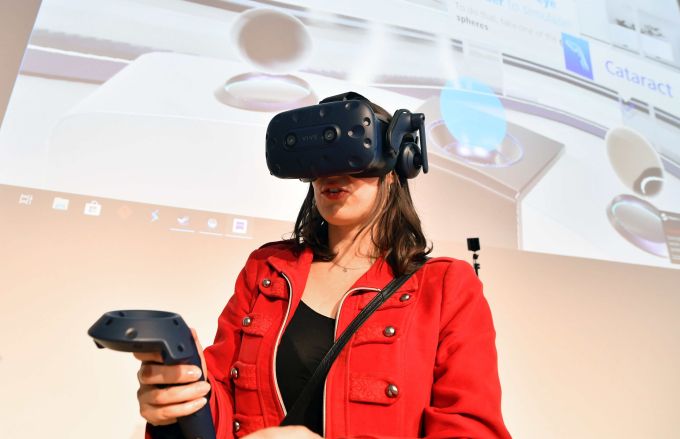 VR-Simulation von Augenerkrankungen des Zeiss Vision Science Lab aus Tübingen, die sich ebenfalls Ende Oktober bei der Exkursion vorgestellt haben – im Bild die Lehrbeauftragte Ophélie Traché (Bild: Manfred E. Stich)