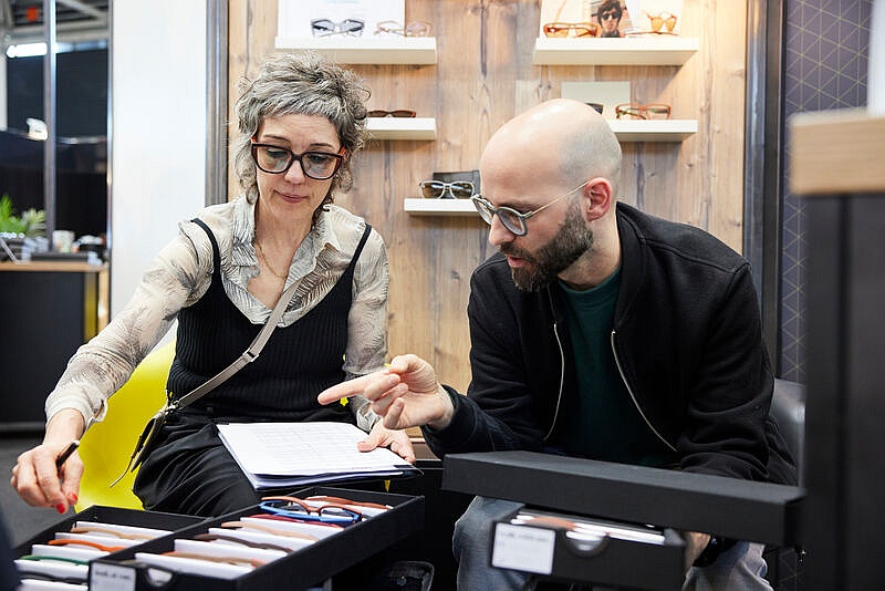 Beate Leinz von Leinz Eyewear im Beratungsgespräch – die Designerin nimmt den ersten opti BOX AWARD mit nach Haus (Bild: GHM)