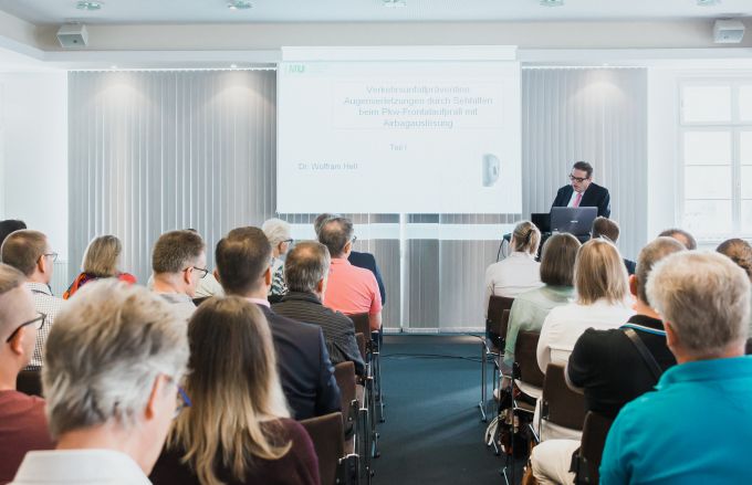 Dr. med. Wolfram Hell, Leiter der medizinischen, biomechanischen Unfallforschung am Institut für Rechtsmedizin der Universität München, beschrieb in seinem Vortrag nicht nur die Augenverletzungen durch Sehhilfen beim Pkw-Frontalaufprall mit Airbag-Auslösung, sondern auch, welche Verkehrsunfälle mit einfachen Mitteln vermieden werden könnten. So solle man es als Beifahrer unterlassen, Gegenstände und, noch schlimmer, Kinder auf dem Schoß zu haben.