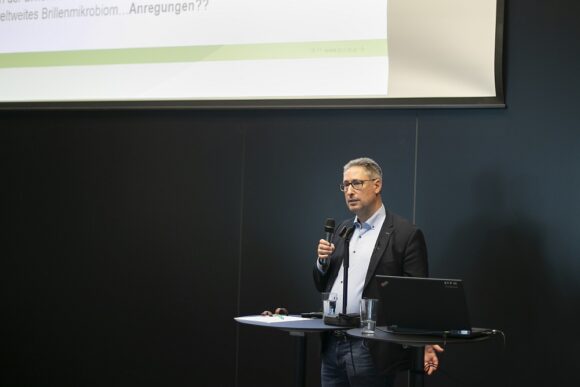 Über die Vielfalt von Mikroorganismen auf Brillen referierte Prof. Dr. Markus Egert. In seinem Vortrag Brillenhygiene und Keime auf Brillen verglich er die Mikroorganismen auf Brillen von Seniorenheimen mit denen von Studentenheimen. Es zeigte sich, dass eine höhere Vielfalt von Bakterien auf den Brillen der Altersheime zu finden waren. Die häufigsten Keime waren der Staphylococcus-Gruppe zugeordnet, welche auch auf der Haut häufig vorhanden sind.
