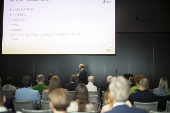 Dr. Wilfried Glatz von der Medizinischen Universität Graz referierte über die wegen ihrer Hartnäckigkeit gefürchtete Akanthamöbenkeratitis. Als Eintrittspforte für diese schwerwiegende Entzündung ist häufig ein Epitheldefekt in der Hornhaut verantwortlich. Die Therapie gegen den parasitären Einzeller benötigt bei Befall des Auges oft langwierige Behandlungen, da sich die Akanthamöben in zwei Formen zeigen können. In der aktiven Form als Trophozoit und in der ruhenden Form als Zyste.