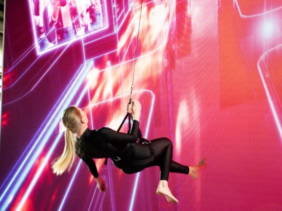 Zeiss punktete in Halle C5 mit der atemberaubenden Performance von Zwillingsschwestern, die abwechselnd in schwindelnder Höhe am Drahtseil gehalten die Dynamik unseres neuen Lebensstils in die Hallen brachten (Bild: Carl Zeiss Vision)