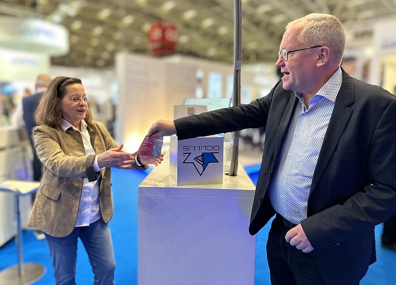 Für Oculus ist die opti als deutsche Leitmesse unverzichtbarer Teil der Augenoptik. Schon früh hat sich das Unternehmen als Fürsprecher des Branchen-Events positioniert, die Besucher dankten es. Auf dem Stand war fast durchgehend viel los, Highlight war die Präsentation des Oculus Myopia Masters mit dem Slogan: „Messen statt Schätzen“. Täglich gab es eine Messbrille zu gewinnen. Peter Frankenstein, Leiter Consumer Optics bei Spectaris, gab die Glücksfee, am Freitagabend gewann das Brillen Studio aus Bielefeld.