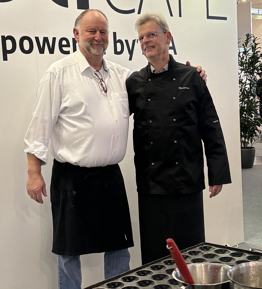 Henry Kunze (links) hat Thomas Truckenbrod das Rezept der legendären Poffertjes verraten. Vielleicht schmeißt der ZVA-Ehrenpräsident zukünftig das opti Café ganz alleine?