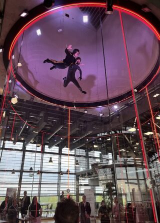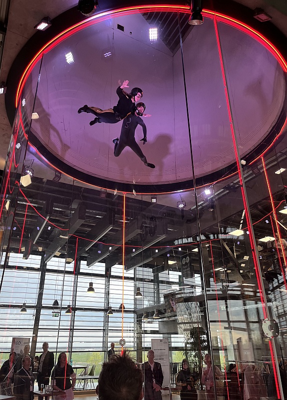 Direkt am Windkanal konnten die anderen Teilnehmer*innen die spektakulären Ausflüge von einer Zuschauertribüne und vom Bistro aus unmittelbar mitverfolgen. „Das war super, eine völlig neue Erfahrung“, so Thomas Heiliger von Heiliger Optik Akustik, der sich eigens aus Aachen auf den Weg nach Berlin gemacht hatte.