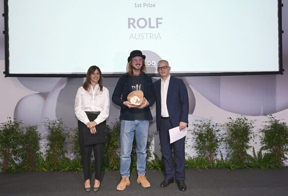 Preisverleihung für Rolf: Petra Loreggian, Niels Overeem und Giovanni Vitaloni (MIDO-Präsident) (Bild: MIDO)