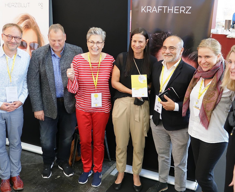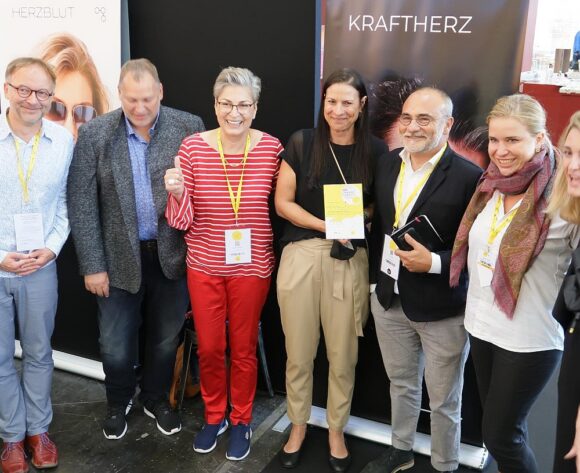 Für die Leverkusener Claudia Hollergschwandtner und Jürgen Beier brachte der Messebesuch eine besondere Bescherung. Der Direktor der Silmo Eric Lenoir verlieh den Gründern von Herzblut den gemeinsam mit eyebizz initiierten eyebuzz Award. Zu den bislang zwei Linien – „Herzblut“ für die Dame, „Kraftherz“ für den Herrn – kommt im Januar 2023 eine dritte Kollektion hinzu, wie Hollergschwandtner verriet: „Geschwisterherz“ für Erwachsene mit kleinen Kopfgrößen. Jürgen Beier, zuständig für Logistik und Kundenbetreuung, erklärte das puristische Konzept: „Sinnvoll mit Maß“. Eric Lenoir und sein Kamerateam nahmen sich viel Zeit, die Gewinner zu feiern – auch mit Champagner.