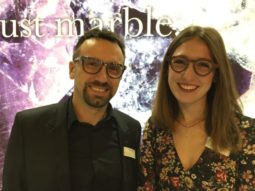 Simone Ceretti, Vertrieb Mora Busoli aus Modena (Italien) (links, mit Veronica Bonfatti): „Unsere Marmor-Fassungen sind leichter, als man denkt. Wir kombinieren beim Mittelteil eine dünne Schicht Marmor mit Carbon, während die Bügel aus massivem Marmor sind.“