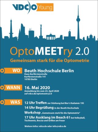 Die VDCO Studi-Vertreter laden herzlich alle Studis am 16. Mai 2020 zur OptoMEETry 2.0 nach Berlin ein. Das Studententreffen findet unter dem Motto „Gemeinsam stark für die Optometrie“ an der Beuth Hochschule für Technik statt. Die Studierenden aus allen Semestern sind herzlich eingeladen, mit ihren Ideen und kritischem Denken den Workshop zu bereichern und die Arbeitsweise eines Optometristen zu hinterfragen.
