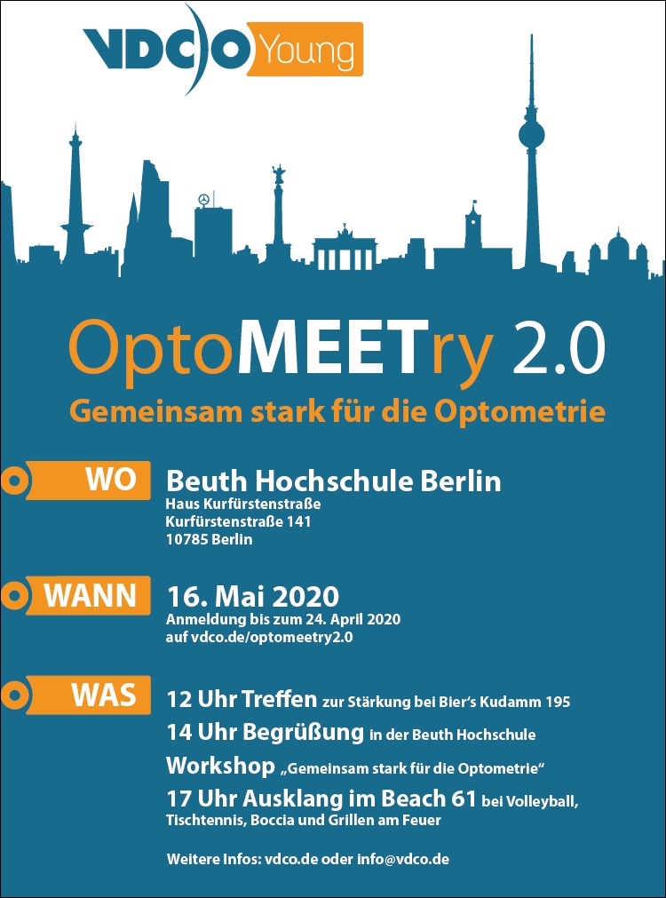 Die VDCO Young hat sich im März erneut getroffen, um den Austausch in der Optometrie weiter voran zu bringen. Eines der großen Projekte ist das OptoMEETry 2.0 am 16. Mai 2020 an der Beuth Hochschule für Technik Berlin. Unter dem Motto „Gemeinsam stark für die Optometrie“ erwarten die Teilnehmer dort Berliner Kult, gepaart mit interaktivem Austausch. Außerdem steht bereits das Grundgerüst für das „VDCO Young Studi“-Forum auf der Sicht.Kontakte 2020.
