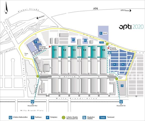 Der Eingang Nord-Ost bietet direkten Zugang in die Messehallen im Osten und war bei der opti 2019 erstmals geöffnet. Diesen stärken wir, um eine paritätische Verteilung der Besucherströme zu ermöglichen. So halten unter anderem die Shuttlebusse von den U-Bahnhaltestellen „Messestadt West“ und „Messestadt Ost“ sowie die Flughafen-Shuttles am Eingang Nord-Ost. Für diejenigen, die mit dem Auto anreisen, werden mit neuen Parkflächen direkt an der Halle C6 die Kapazitäten dort mehr als verdoppelt. Und mit dem neuen Entree, das sich bis in die Halle C6 erstreckt, einer Lounge und Infopoints werten wir den Eingang Nord-Ost zusätzlich auf.