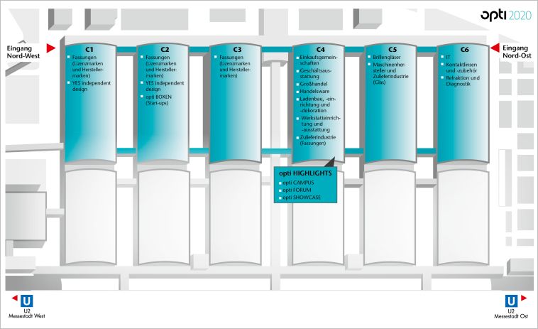 Rund 60.000 Quadratmeter. Die opti 2020 findet wie im Vorjahr in sechs Hallen, C1 bis C6, auf dem Messegelände München statt. Und Besucher sehen dort gleich zu Jahresbeginn alles, was die Branche zu bieten hat: Gläser, Kontaktlinsen, Brillenfassungen, Refraktion, Diagnostik, Low Vision, Maschinen, Rohstoffe, Hör- und Akustikgeräte, Ladenbau, IT-Lösungen und Zubehör. Hinzu kommt der Bereich Weiterbildung und Wissenstransfer mit dem opti Campus und dem opti Forum.