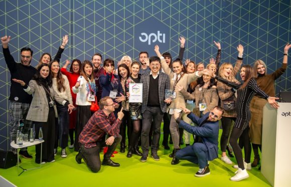 Verleihung des Blogger Spectacle Award – der beste Newcomer aus den opti-Boxen wird mit dem Award ausgezeichnet auf der Bühne des opti-Forums in der Halle C4. Gewinner 2019 war Brian Hau (Mitte) von der Firma Rounder Rounder, opti-Box 15 Halle C2, hier mit allen Bloggern des Blogger Spectacles 2019 (Bild: GHM)
