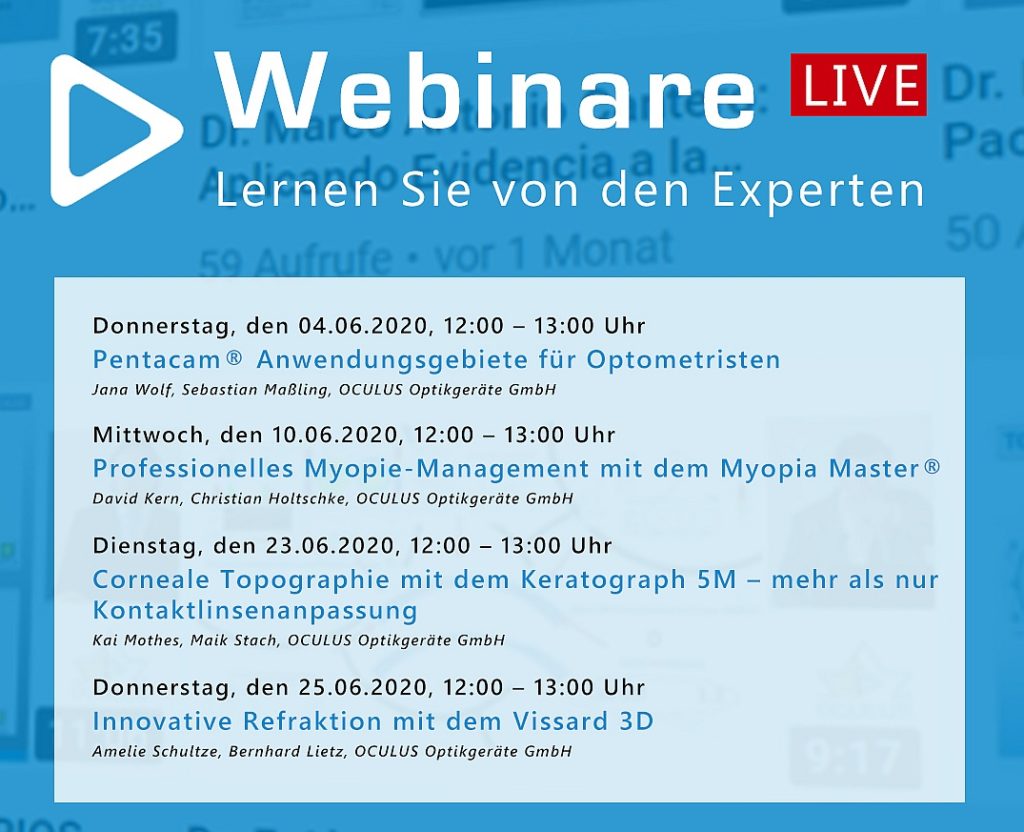 Zuhause bleiben und nichts verpassen: In den nächsten Wochen bietet Oculus viele Webinare kostenlos in Deutsch und Englisch an. Von den Themen ist alles dabei rund um Screening, Kontaktlinsenanpassung und Refraktion. Außerdem finden ab dem 17. Juni 2020 unter Berücksichtigung der gesetzlichen Bestimmungen und des Oculus-Hygienekonzepts wieder Veranstaltungen der Oculus-Akademie statt.