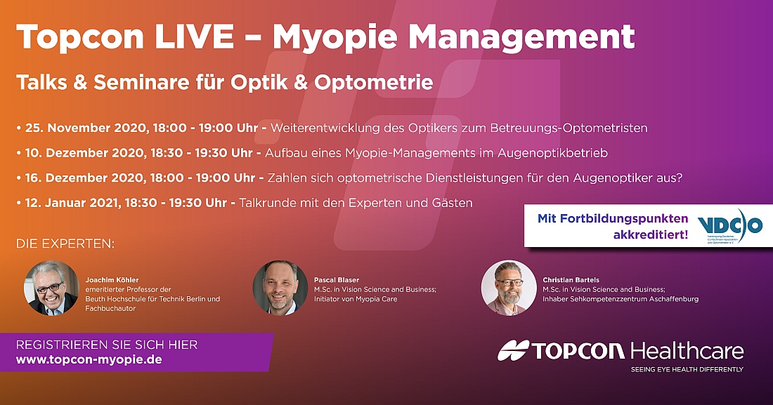 Die Online-Seminare werden von der VDCO (Vereinigung Deutscher Contactlinsen-Spezialisten und Optometristen) jeweils mit einem Fortbildungspunkt gefördert. Joachim Köhler, Pascal Blaser und Christian Bartels nähern sich der Myopie-Kontrolle in der augenoptischen Praxis von unterschiedlichen Seiten und in verschiedenen Formaten: Als Online-Vortrag, im kurzweiligen Interview und in einer Talkrunde mit allen dreien ergänzt um einen Experten von Topcon Healthcare.
