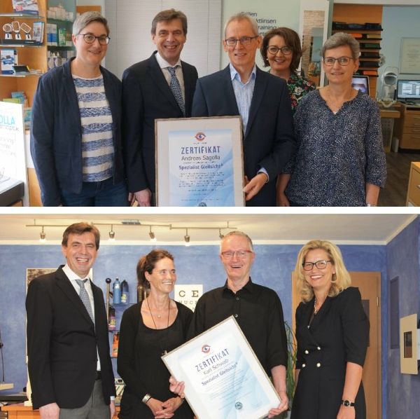Besondere Premiere am 17. Mai 2018: Andreas Sagolla vom Sehzentrum Sagolla Augenoptik in Schwaig und Karl Schwab, der Brillenmacher in Eckenthal-Forth, bekamen am selben Tag in zwei unterschiedlichen Pressekonferenzen von WVAO-Geschäftsführer RA Hartmut Glaser die Auszeichnung zum Spezialisten Gleitsicht Plus der Wissenschaftlichen Vereinigung für Augenoptik und Optometrie überreicht.